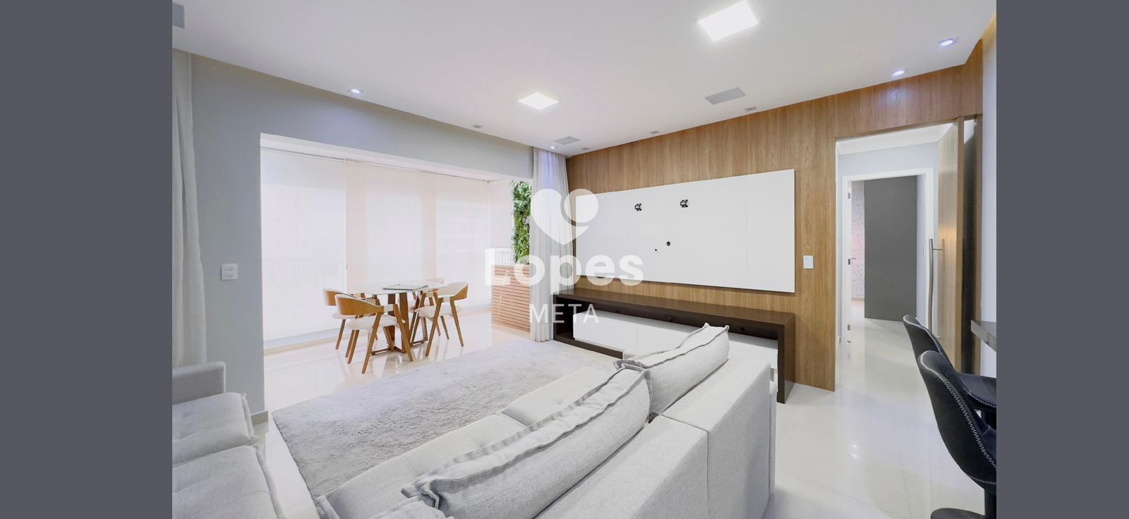 • Sala ampla para dois ambientes com móvel planejado, TV embutida e tratamento acústico